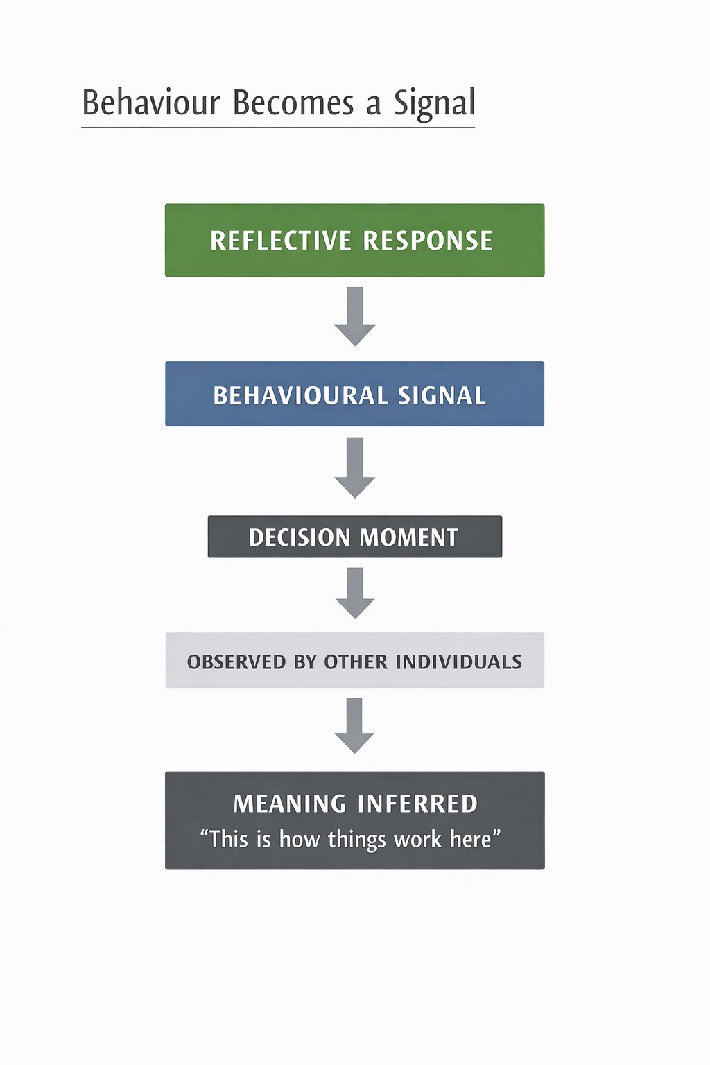 Reflective Behaviour Pathway System Pressure ↓ Decision Moment ↓ Reflective Response ↓ Behavioural Signal ↓ Feedback Loop ↓ Culture Formation